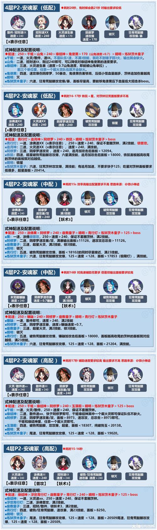 〖贰〗、首先,需要的式神包括:1大舅妈,2铃鹿御前,3小天狗,4山兔,5座敷童子。其次,关于御魂的要求是:1山兔需要散件,优先选取高速度和高攻击,速度至少达到200,攻击值越高越好。2铃鹿御前应携带针女和歌姬,以确保P1和P2阶段顺利通关。3大舅妈同样使用针女和歌姬,但需确保速度高于135。