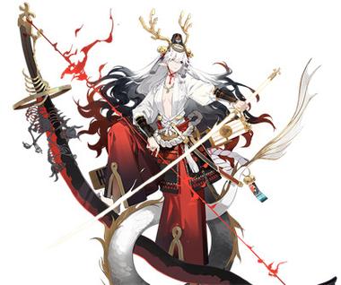 〖伍〗、我们这边可以看到这个铃鹿御前头上有着一个鹿角,然后身上的配色是红黑相间的,看上去是一个男性式神。手上拿着一把非常巨大的弓,应该是一个比较强势的输出型的式神。阴阳师已经好久没有推出过这个拿长弓的式神了,想必技能上和大岳丸也有着一定的关系。