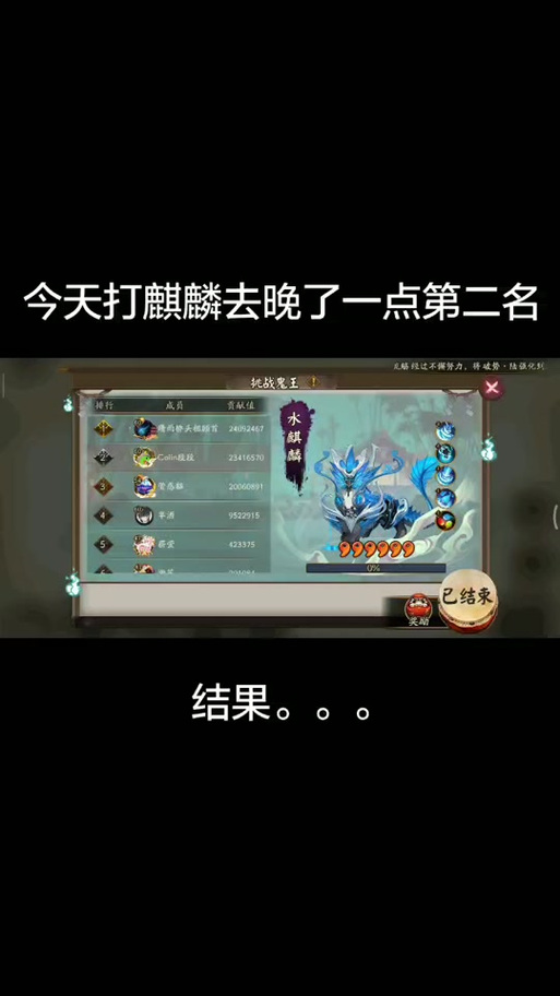 奖励包括:700阴阳寮勋章 个人勋章 勾玉 箱子(有概率包括体力、勾玉、符咒、结界卡)金币 式神碎片 6星御魂 例子:第二名的奖励情况,包括了2个六星御魂,比四星多了个位置 麒麟技能:以风麒麟为例:主要是飓风般的速度和退条效果,血量在1400W,伤害有所提高。