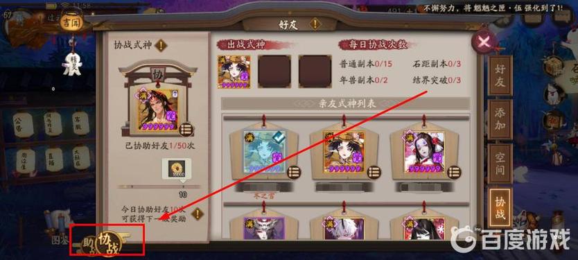 〖伍〗、在《阴阳师》游戏中,若想找到协战功能,首先需要进入主界面,找到好友选项。点击进入好友界面后,你会看到一排好友的名字。在这一排好友的名字右侧,你会注意到有一个协战的按钮或选项,点击它即可进入协战界面。在这里,你可以选取与你有亲密关系的好友所拥有的式神进行协战。