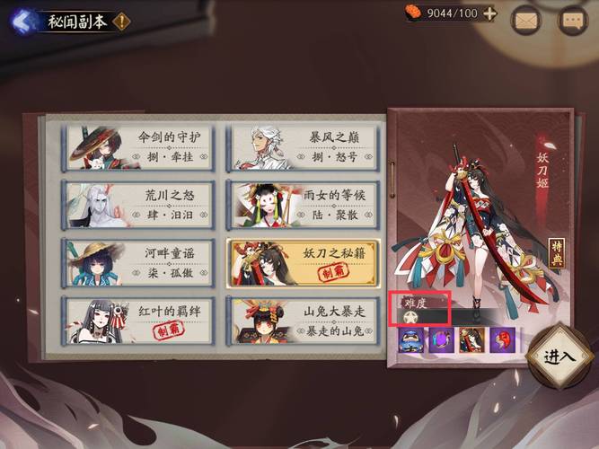 〖叁〗、打开探索界面,在地图的正中央,就可以看到困难挑战副本妖刀之秘籍。每次层每次挑战需要消耗3点体力,仅限单人挑战。每一层都是由妖刀姬作为boss把关。因为都是觉醒的。所以妖刀姬的大招是比较棘手的。妖刀姬技能介绍 不详之刃:单体100%攻击,无特效。