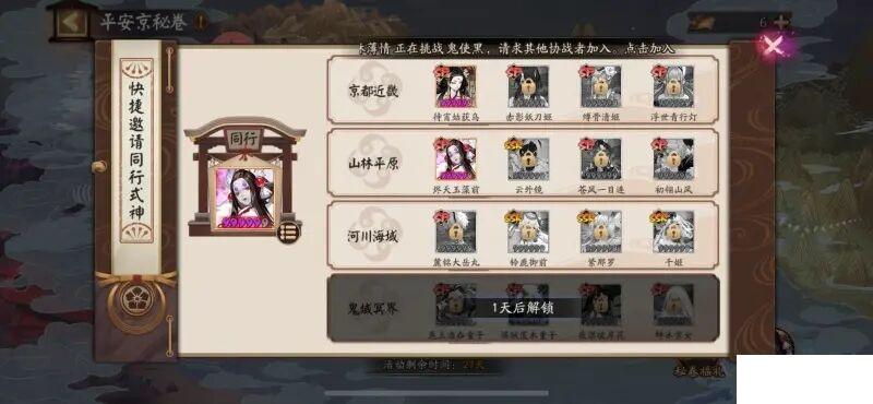首先这个平安京秘卷活动的地图共有4个区域,分别是京都近畿、山林平原、河川海域和鬼域冥界。每个区域的每个式神都会有4种绘本:绘本·技、绘本·魂、绘本·忆和绘本·契。点开区域式神界面可看见4种绘本围绕在式神的左右两侧。右上角会显示当前所拥有的绘本数量。