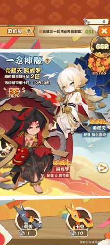 〖肆〗、输出式神推荐:选取单体爆发高的式神是关键。R级推荐九命猫,SR级推荐妖狐、鬼使黑、鬼使白、姑获鸟、犬神。至于SSR级的顶尖选取,则有妖刀姬、茨木童子、荒川之主、阎魔。辅助式神推荐:重视控制能力的同时,兼顾增减回合等强大功能的式神同样重要。