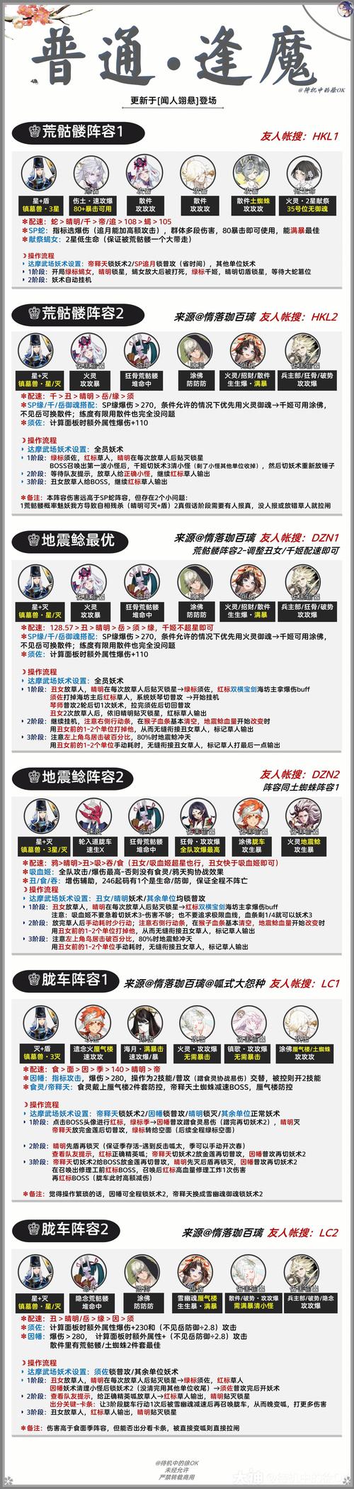 〖贰〗、首先,我们需要明确逢魔入侵的通关条件。这不仅包括对敌方的直接攻击,还需要在对手的土蜘蛛中存活一定回合。对于初阶玩家来说,推荐使用以暴力输出为主的阵容,如蝙蝠翼地震鲶鱼,无需特别考虑御魂搭配,直接挂机即可,保持对手攻击五回合即能获得胜利。地藏地震作为辅助,提供生存能力,确保团队稳定发挥。