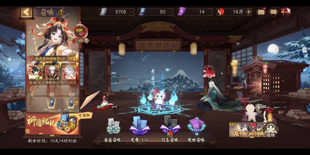 〖叁〗、七天免费一抽:玩家可享受七天内的免费召唤机会,并且这个免费机会可与500天签到的每天一抽叠加。 60抽保底出SSR/SP:即连续进行60次召唤,必然会出现SSR或SP级别的式神。 满抽送大礼:达到40抽、100抽时,玩家将分别获得随机SSR/SP的奖励。这些奖励的式神不占用未收录的名额。