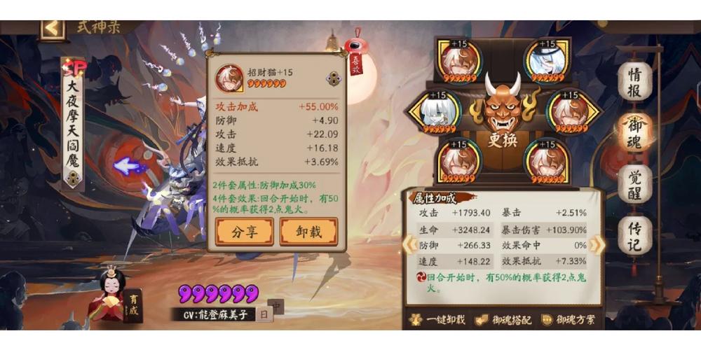 〖叁〗、“头”,指二号位主属性速度,附属性加17,招财的“头”是比较好的,毕竟谁不想拥有一只+157的镰鼬,一路双拉上八段。“脚”,四号位主属性命中附属性加22。如果“脚”是火灵就给阎魔,是魅妖就给星熊童子或者彼岸花。“真全图”,指玩家的所有sp,ssr,sr,r,n,呱太,联动式神,两面佛全部都有。