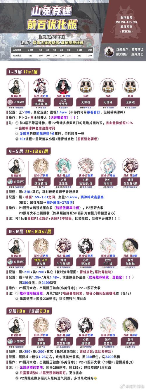〖叁〗、①黑科技阵容:四山兔舞法天女,带座敷和博雅,输出靠博雅磨。博雅带多重箭和三连击,因为影分身导致天女被反击断舞。不过缺点是容易被插队和反击。②普通阵容:双拉条1速和2速+座敷3速+输出4速+辅助(惠比寿、椒图、奶妈)+阴阳师任意。6-10层:进入地狱模式,不管是对面的输出还是抢1速都非常变态。