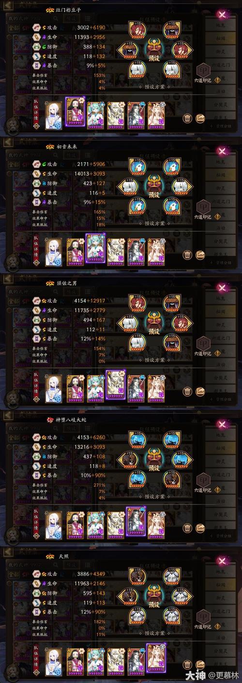 〖肆〗、拉条阵容:采用双拉条策略,使用攻攻爆伤的茨木和晴明灭,自动操作,主要依靠技能进行攻击。这样做的原因是单拉条时,对面第二个鬼头会插队,给一只怪物套上反伤效果,导致茨木无法看到第三回合。无拉条阵容:选用茨木(2号位速度,6号爆伤)和火灵式神,搭配晴明,主要通过技能进行输出。