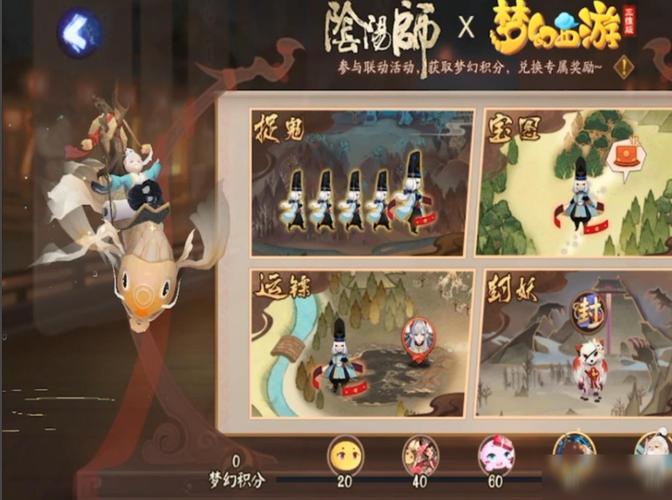 〖叁〗、联动活动中,完成指定任务可累积梦幻积分,积分可用于兑换联动专属的物品,如泡泡、插画、动态头像框和皮肤福禄金尊。联动活动包括捉鬼、宝图、运镖和封妖等玩法,让玩家体验梦幻西游与平安京的融合故事,同时获取游戏内奖励。