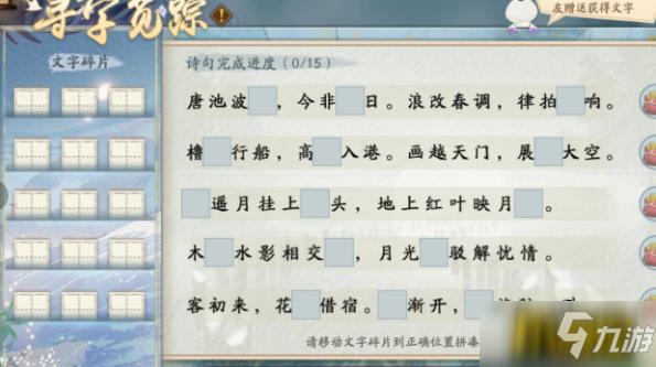 摆放碎片 拼凑诗句 获得文字碎片后,大人可在活动界面将碎片放至对应的文字空白处,通过调整文字碎片的位置,拼接成完整且正确的诗句。文字碎片可重复获得,大人可以选取「赠字」,将多余的文字碎片赠送给需要的好友。