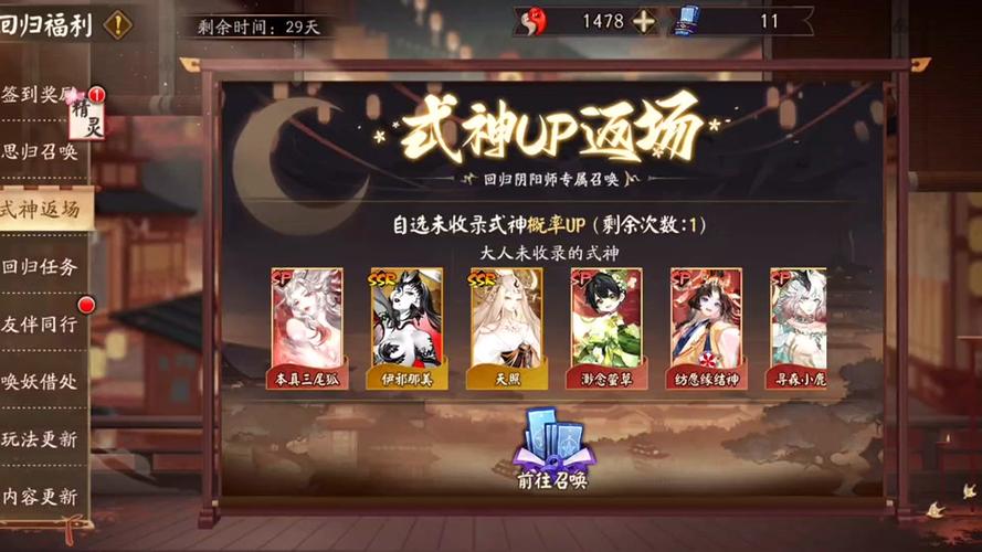 〖贰〗、《阴阳师》回归自选ssr条件是等级大于等于15级,离开游戏超过7天。玩家回归后每天完成指定任务达到指定积分,即可获取对应奖励。阴阳师们可以前往庭院左侧的灯笼架,点击召回好友。