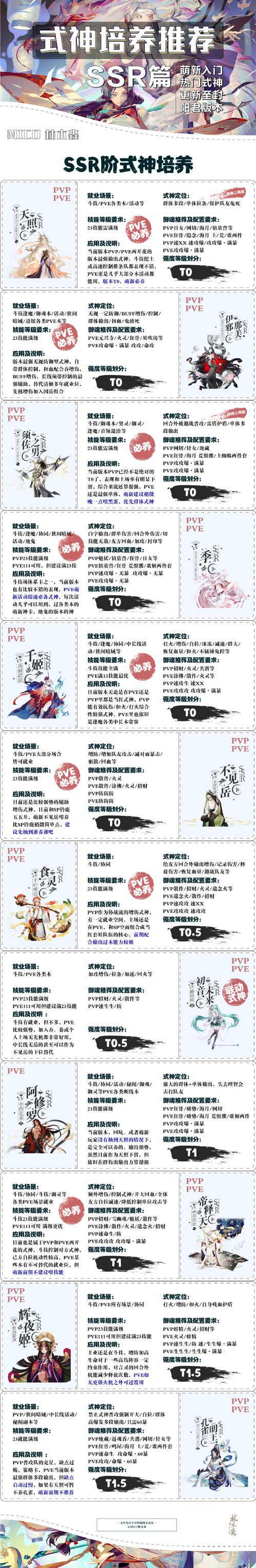 〖陆〗、桔梗有驱散、吸伤和封印技能,但因版本原因未在斗技场上找到位置,不推荐培养。T0:八岐大蛇,全面提升游戏体验的卡,缺点是耗黑蛋。T1:泷夜叉姬(茶几),斗技中少数纯输出之一,适合爬塔和鬼王活动。不知火,体系式神,PVP和PVE表现截然不同。T2:斗技:阎魔、白藏主、御馔津、大岳丸。