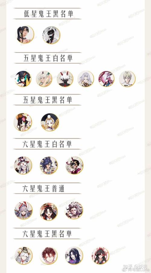 五星鬼王白名单包括妖刀姬、大天狗、紧那罗、大岳丸、泷夜叉姬。这几个五星鬼王相对简单,使用通用阵容就能轻松解决,基本开强力可以直接一波清掉。六星鬼王白名单则包含八岐大蛇、帝释天、sp花鸟卷、荒。对于八岐大蛇和sp花鸟卷,推荐使用帝释天和sp花鸟卷的通用阵容,因为boss的死战效果几乎不存在。