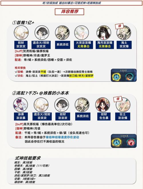〖肆〗、新区预约推荐式神在新区初期,为了快速发育,建议选取以下PVE式神。输出方面,SSR天照作为新晋数值怪,SSR季的三兔子季伤害机制独特,SSR须佐之男单体伤害高;SSR阿修罗数值高且动画快,但需注意其可能误伤队友;SP神堕八岐大蛇帅气但输出节奏稍慢;孔雀明王是长线输出好手,但暖机时间较长。