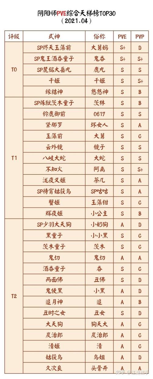pve(副本)式神强度榜t0(开荒首选):阿修罗、鬼王酒吞童子、因幡辉夜姬、不见岳、须佐之男t1(强度很高):妖刀姬,烬天玉藻前,浮世青行灯,紧那罗,铃鹿御前,缘结神,帝释天、空相面灵气、绘画花鸟券、因幡辉夜姬。