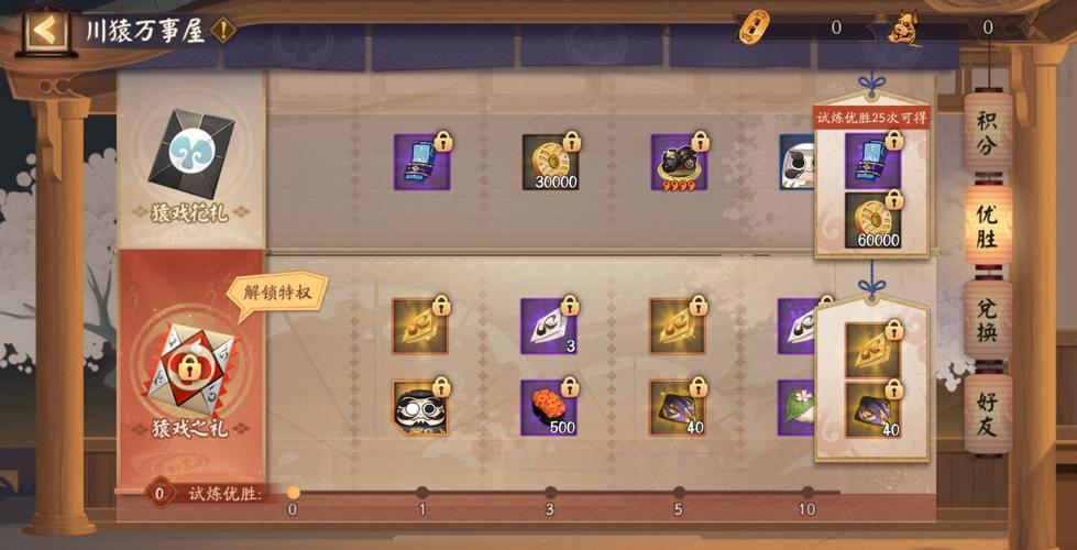 缘结之境(爬塔),可以获得分数(换商店物品)、金币、同心结(给河童谈恋爱)、御魂、觉醒道具、狗粮。层数越高,奖励越好。缘结神社商店。