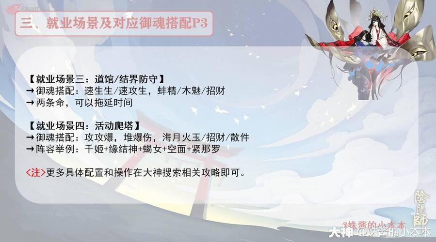〖伍〗、山风有两种玩法,一种是攻攻爆伤,不带速度。带神乐疾风拉一次,开场放两次大招,可以使对面减员。第二种玩法就是二号带速度,持续给敌方残血单位添加禁疗状态,来压制敌方,最终获胜。山风的阵容搭配推荐:辉夜姬、镰鼬、花鸟卷、椒图、金鱼姬或数珠。综上所述,山风是一个适合培养的强力输出式神。