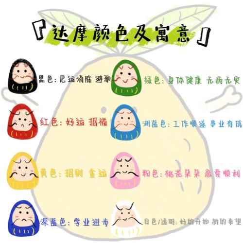 〖贰〗、日本的12色达摩,每种颜色都代表不同的寓意,深受人们喜爱。红色的达摩象征胜负运,适合本命年或竞赛者。 黄色达摩代表金钱运,能为财富积累带来好运。 深蓝色达摩对应学业运,有助于提高学习效率。 绿色达摩寓意健康运,能保佑身体健康。 黑色达摩象征储蓄运,有助于积累财富。