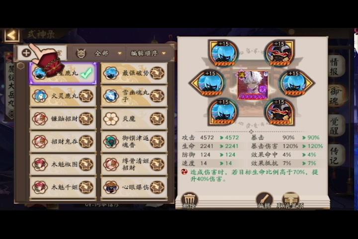 〖肆〗、当然,考虑到辉夜姬的buff是自身行动2回合消失,为了最大限度利用BUFF,也可以把辉夜姬放5速,一目连和咕咕鸟上去。这样就在第一波的时候少一次招财触发,只要点不是太背,基本椒图的技能是放的出来的。