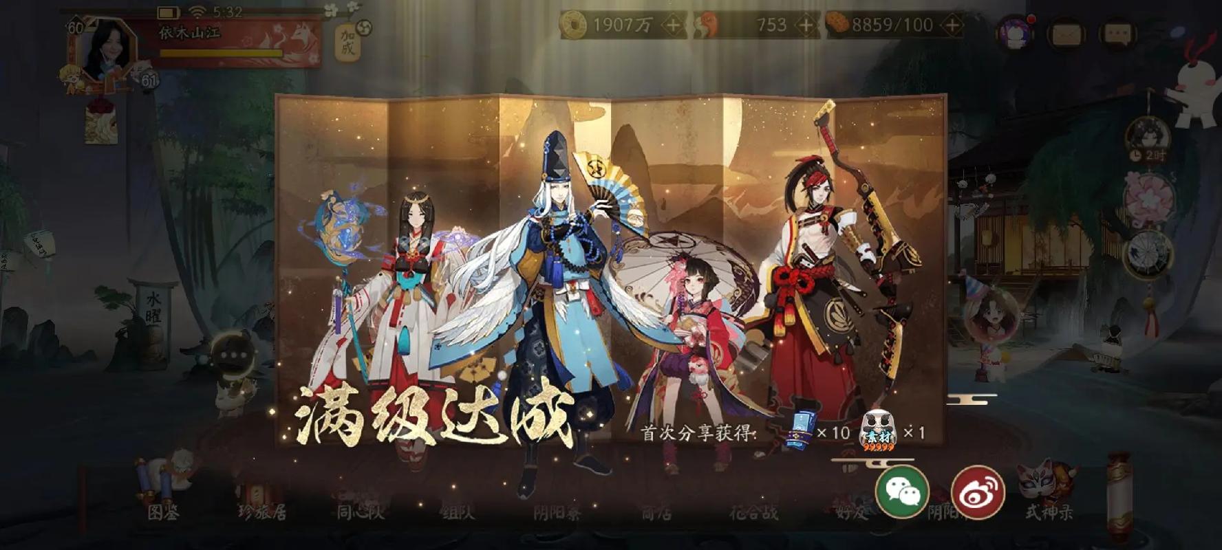 阴阳师满级成就:所有玩家达到60级后将自动解锁“满级达成”成就,分享该成就即可获得满级礼包一份。礼包内含:五星奉为达摩*1,神秘的符咒*10。如果未能及时分享,不用担心,之后再分享就行了,下次登录还会跳出界面。
