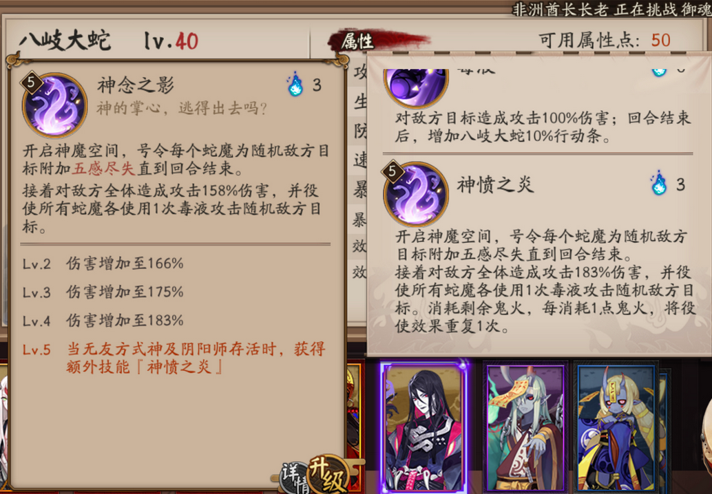 〖壹〗、无法改变生命上限,生命为神堕八岐大蛇攻击200%,免疫减益和放逐。当蛇神破除天羽羽斩镇压或被受到致命伤害时,本体重新回到场上。堕落之剑 唤醒被封印邪神之力的祭品,继承自身被献祭时的属性,免疫控制效果和放逐。行动时为自身恢复20%血量,为神堕八岐大蛇增加15%行动条和1点鬼火。