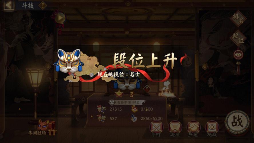 初始段位为1段,每周一自动下降一段(最低为1段),且段位不同,荣誉上限与奖励也不同,比较高为8段,可获得300勾玉与20张皮肤卷的奖励。每周一,这些奖励将通过邮箱发送到玩家手中。在组队时,玩家可通过对面阴阳师主角带的面具来判断对方的段位,面具颜色越深,表示对手越强大。