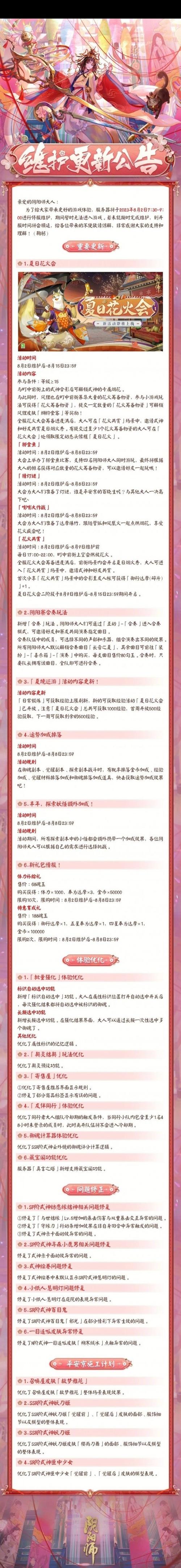 〖叁〗、阴阳师手游7月28日更新什么内容?7月28日阴阳师体验服更新于7月28日(周五)早上6:00 - 9:00进行停服维护,包括了彼岸花、兵俑被砍,一大批式神技能调整,新增「百鬼弈」玩法,下面带来更新内容详细介绍。