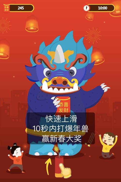 〖贰〗、进入年兽挑战后,年兽会首先发起猛冲,这时玩家需要跳起来躲避攻击。下面,玩家需要不断投放爆竹对年兽进行攻击,这是快速降低年兽血量的有效手段。在使用爆竹的过程中,玩家需要注意躲避年兽的反击,这样可以有效减少自身的伤害。通过持续使用爆竹,玩家可以成功击败年兽。最后,玩家就能顺利完成挑战,获得胜利。