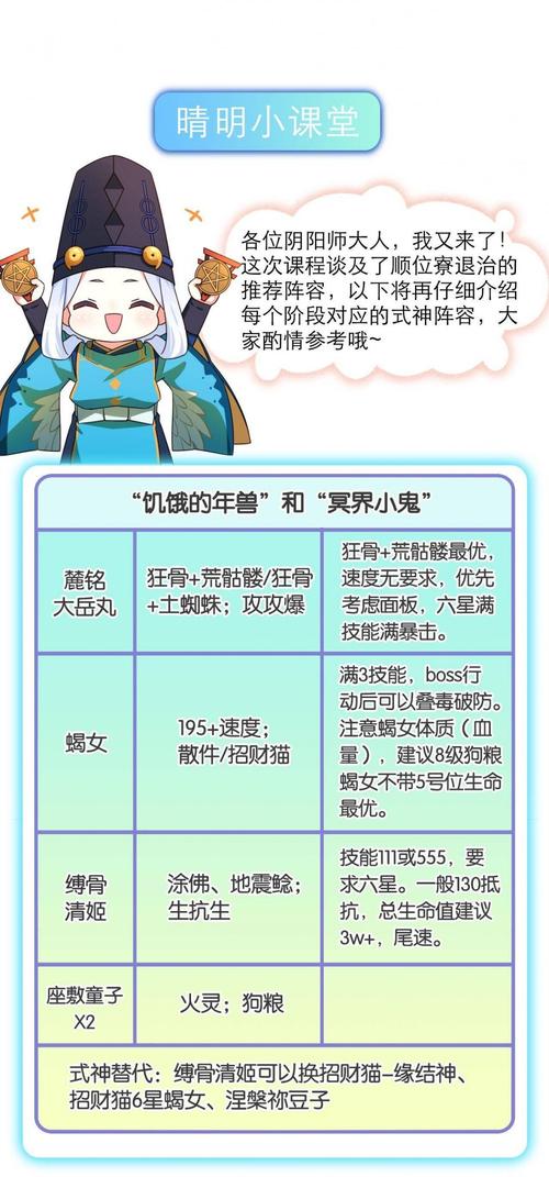 〖贰〗、参与退治的寮友较少时,推荐破势土蜘蛛、丑女、书翁及双输出(如蜜桃、花鸟卷等)。输出可进行aoe或单体攻击,这个阵容适合人数较少时使用,每个首领只需约3分钟,时间不算长,游戏体验也不错。丑女和书翁可以替换为各种输出式神,如丑佛、狗子、大舅、茨木等。推荐的打全场阵容与逢魔阵容类似。