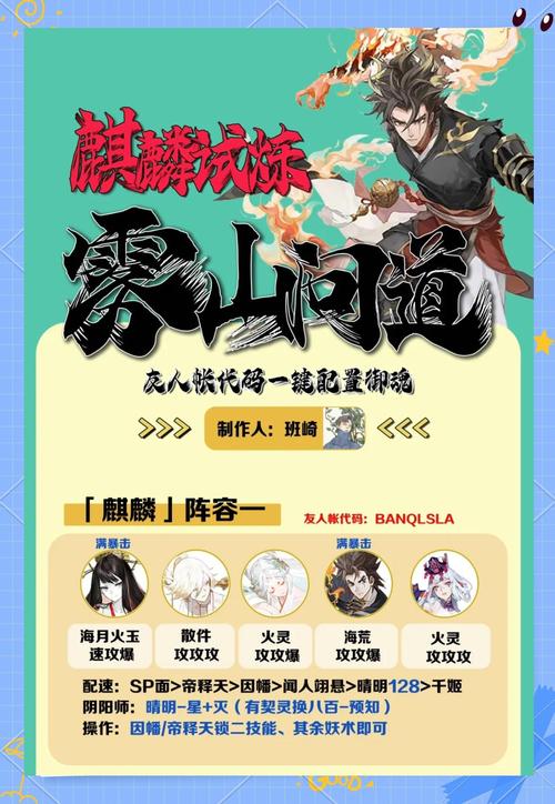 〖贰〗、《阴阳师》狩猎战水麒麟高分玩法攻略如下:大寮玩家策略:使用麓献祭流:大寮玩家可以选取使用麓献祭流进行战斗,这是一种高效且快速的打法。火源选取:可以选取海月座敷童子或者1火青蛙作为火源,以确保技能的顺利释放。阵容调整:如果寮内打得很快,建议将缚姬换成祢豆子,以进一步提升输出效率。