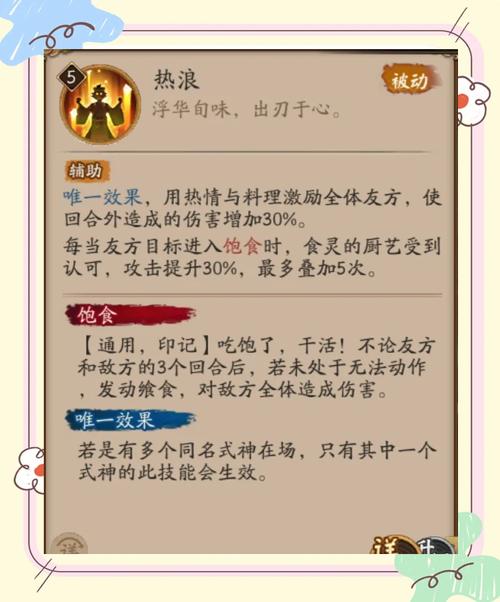 〖肆〗、技能【热浪】消耗:被动 “唯一效果。”用热情与料理激励全体友方,使回合外造成的伤害增加30%。每当友方目标进入【饱食】时,食灵的厨艺受到认可,攻击提升30%,比较多叠加5次。