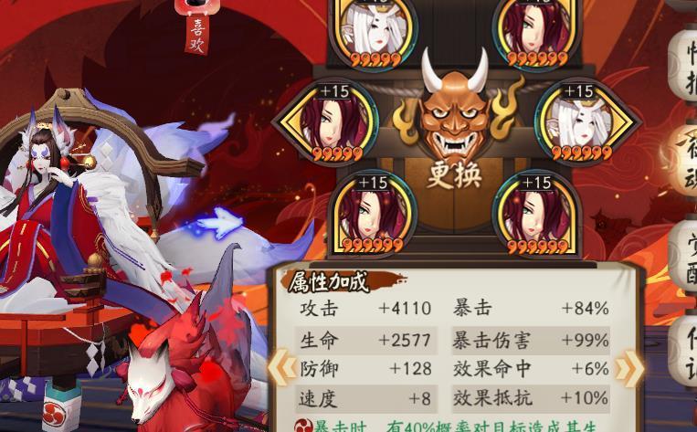 〖贰〗、这套阵容包括鬼使黑(狂荒,六星)、丑女(狂荒,随意等级)以及山兔(火灵,等级随意)(或者山兔散件,搭配一个火灵狗粮或座敷)。首先关注鬼使黑,虽然每个位置都有些偏颇,但荒骷髅运气颇佳,副属性是暴击,拥有+40的暴击值。其他属性则可以专注于堆叠暴伤。
