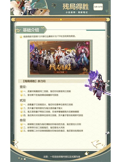〖贰〗、阴阳师残局得胜鲸甲歌通关攻略 鲸甲歌第一关:化鲸三技能体甲,给玉藻前「体甲两次即可通关」。鲸甲歌第二关:化鲸二技能齿甲,给鬼切;鬼切三技能带走玉藻前,然后先杀海坊主,再杀惠比寿;化鲸不知火出手普攻即可;鬼切最后可以再开个三技能,收尾。