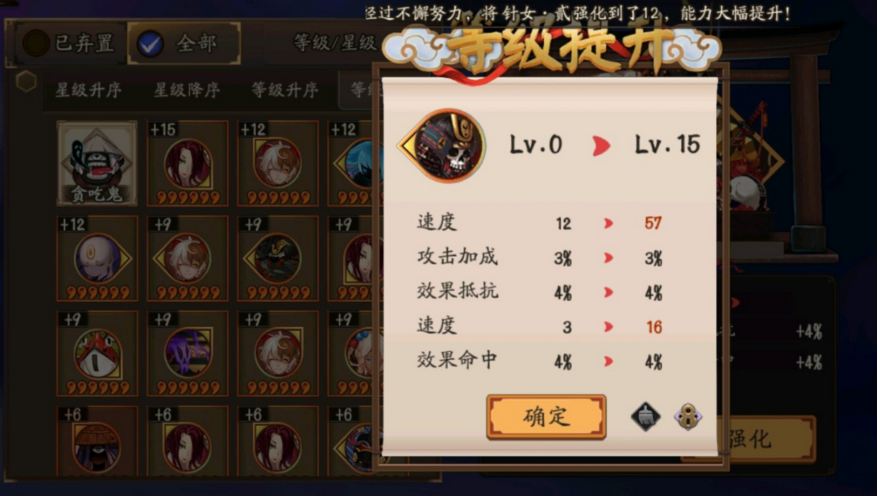 式神的培养:对于第一个升五星的式神选取,用来带升星素材式神的群攻式神,关于群攻式神,最优先选取是:茨木、姑获鸟、大天狗,其次是红叶、鬼使黑,也可以选取络新妇、鬼使白、巫蛊师。