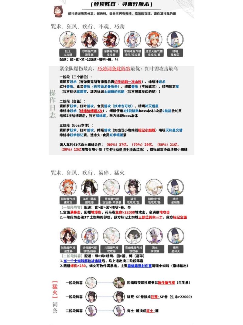可以集结好友、附近的人、寮友一起打,也可以独自挑战。战斗不耗体力,奖励包含体力。土蜘蛛有三个位置要击破,击破后会制造小蜘蛛,需要清理小蜘蛛。优先攻击秘宝小纸人,可获得额外奖励。推荐阵容:阵容一:心眼丑时之女+针女姑获鸟+高速破势吸血姬+桃花妖+惠比寿+神乐,适合多种情况。