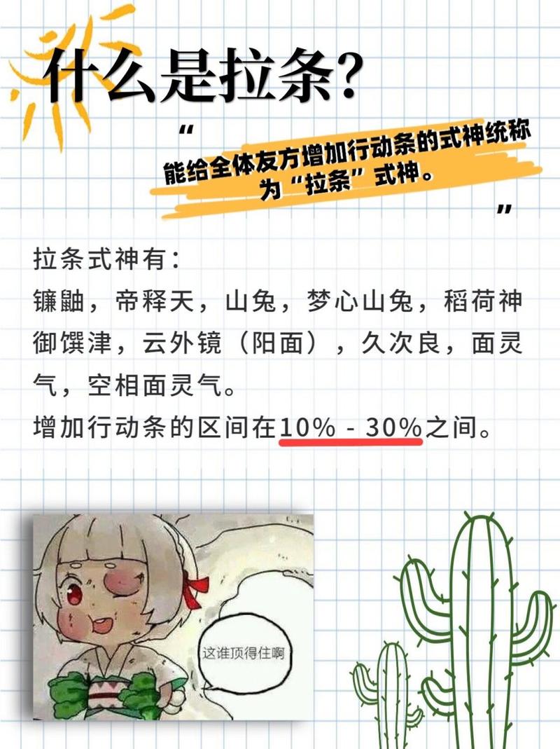 拉条名词解析:式神出场顺序以进度条为准,所有人基于同一起跑线出发,因为有速度差距进而有先后手差距。拉条可以减少长度,让式神更快的出手。式神在游戏中作为阴阳师玩家角色的作战单位,式神主要获得方式除了主线剧情之外,还是需要通过游戏中玩家进行抽取获得,召唤需要阴阳师用符咒进行召唤,召唤分为三种。