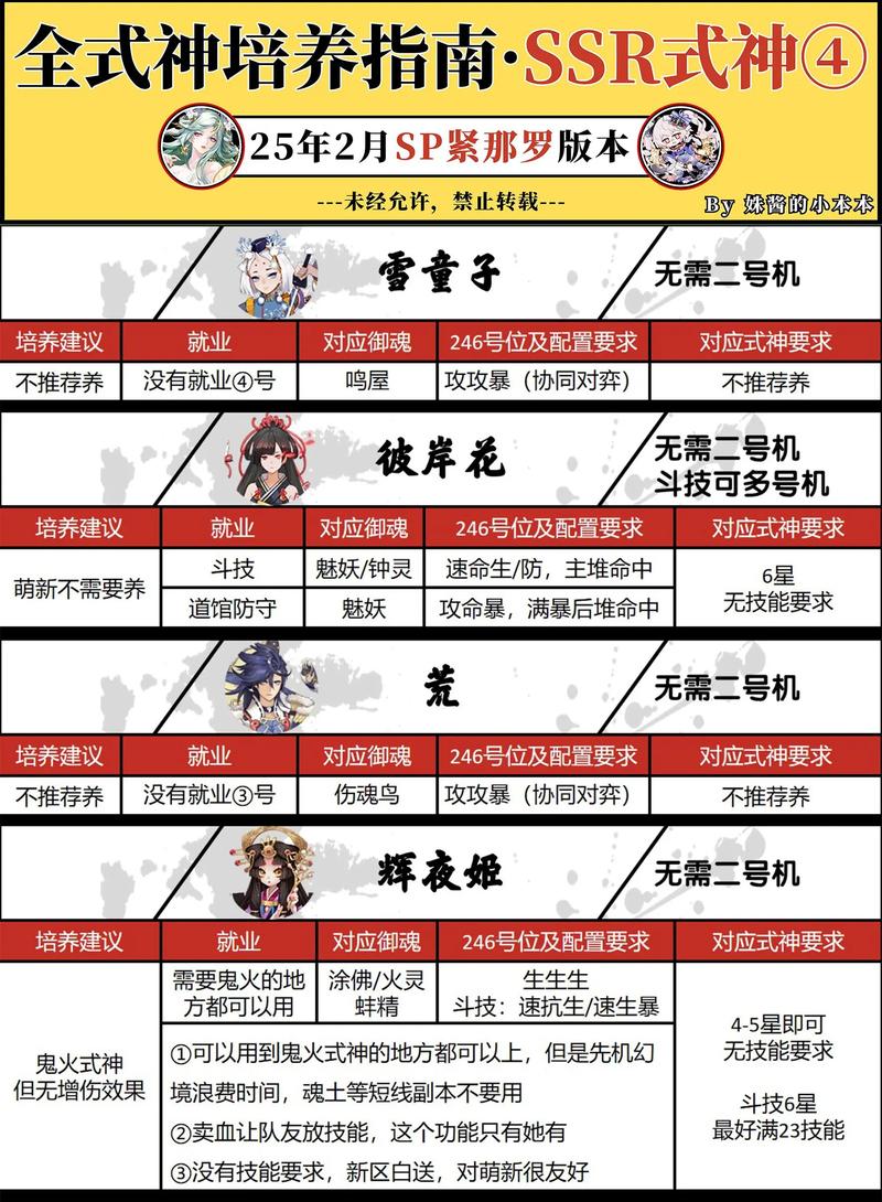 在阴阳师中,以下SSR式神可以考虑返魂:荒川之主:虽然觉醒后自带20%暴击率,降低了御魂配置难度,但在当前的游戏环境中,可能有其他更强势的SSR式神替代其位置,因此可以考虑返魂。