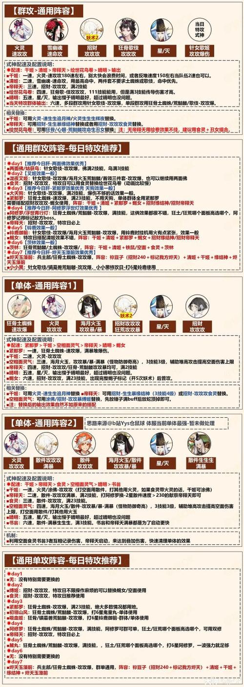 -4星超鬼王可以全程使用这套阵容。除了部分特殊词缀外,5-6星的大部分情况也可以一直使用这套。由于这套阵容以清Boss为主,所以没有单体阵容。清姬:雪幽魂+土蜘蛛,速命攻,速度160+。千姬:涂佛/招财猫,攻攻攻,速度140+。绘世花鸟卷:狂骨+鬼灵歌伎,攻攻攻,速度128+。