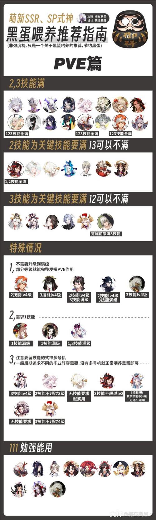 p在阴阳师游戏中,升级式神技能的主要途径有两种:一是喂食相同的式神,二是喂食御行达摩。御行达摩是一种黑色的达摩,作为素材强化其他式神,使所强化的式神获得一次技能的提升机会。因此,许多玩家倾向于选取将黑蛋喂给稀有的式神,以期通过这种方式提升其技能等级。