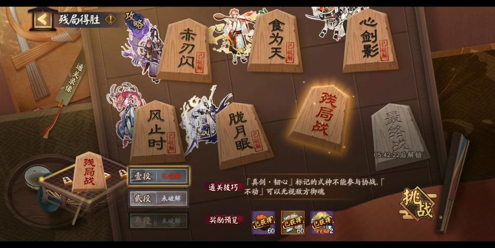 〖叁〗、阴阳师残局战通关流程如下。第一关:①薰普攻云外镜,大岳丸三技能放逐镜子;②化鲸给大岳丸套上齿甲;③不知火&薰分别普攻山兔和帝释天;④大岳丸再次行动放逐镜子即可。