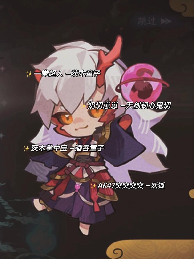 小缘:元气少女小缘,展现她活泼的性格。鬼吞:茨木掌中宝,显示他的珍贵与重要。茨林:小拳拳捶胸口,表现他的力量与可爱。茨木:小手冰冰凉,带有一丝神秘与清凉感。酒吞一号:奈斯兔咪兔,表达他的欢乐与调皮。酒吞二号:奈斯兔咪兔兔,加上微笑符号,展现他的友好。