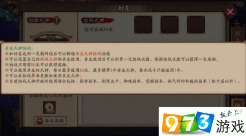 〖壹〗、祈愿:- 玩家可以在祈愿系统中发布自己想要的式神碎片的需求。- 祈愿每24小时只能发布一次。- 根据所需求的式神碎片的稀有度,玩家可能会获得不同数量的勋章。- 每个祈愿每次只能捐赠一次。 结界突破:- 玩家达到9级后解锁结界突破玩法,分为个人结界突破和阴阳寮结界突破。