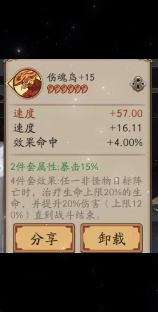 〖伍〗、御魂效果 暴击组件,2件+15%暴击,相当实用。式神使用攻击类的技能只要在鬼火够的情况下,会多消耗1火,伤害大幅提升百分之40。PVE建议强度非常高,是输出方面的顶尖御魂了。基本上和狂骨持平,在一部分状况下略胜狂骨一筹。