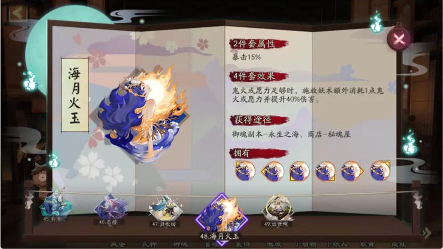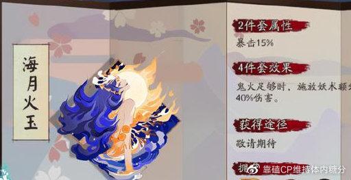〖叁〗、阴阳师海月火玉搭配式神推荐御魂介绍两件套:暴击15%四件套:鬼火足够时,施放妖术额外消耗1点鬼火并提升40%伤害。
