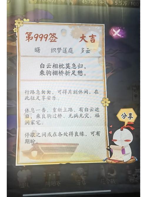 〖叁〗、在阴阳师游戏中,签到运势对抽卡没有实际影响。游戏中提供了五种签到运势选取:大吉、中吉、小吉、半吉和末吉。根据实际情况来看,这些签到运势仅仅是对玩家日常签到奖励有所影响,并未对抽卡产生任何效果。