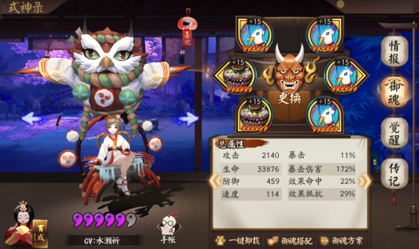 〖贰〗、晴明、追月、丑时之女、书翁、清姬 晴明可以选取星和缚或灭,与大天狗、茨林、玉藻前等aoe式神搭配,清小怪时配合两面佛;打血厚的boss时配合茨木、赤影妖刀姬。