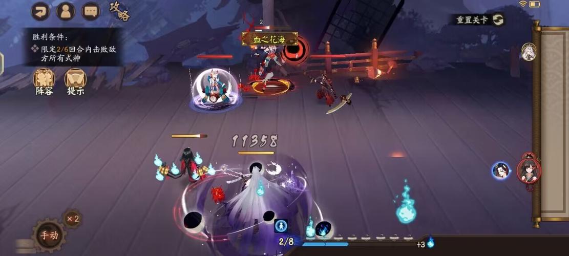 胧月眠一段 茶几切换成普通攻击打犬神,再使用三技能打吸血姬,最后切换成群攻技能攻击敌人。茶几的二技能可以切换自身技能形态,左边是群体攻击,右边是单体攻击,每一种攻击形态有4种可选效果。