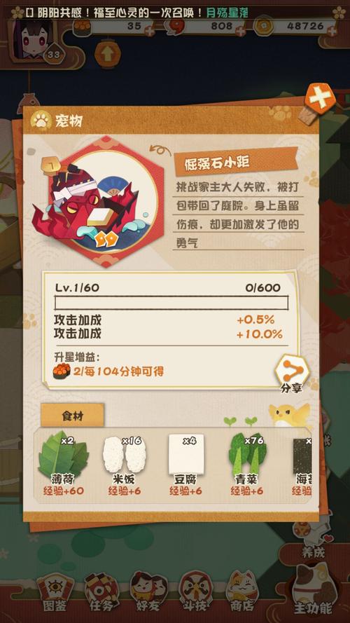 这里给大家带来详细的升级方法教学,希望能帮助到各位感兴趣的玩家~阴阳师妖怪屋宠物升级方法玩家需通过参与首领讨伐来收服宠物,讨伐时所选取的是哪个目标最后拿到的也就是对应品种的宠物。例如玩家打到石距之后就可以收服石小距,而被收服的石小距还可能会存在原版以及三种分支性格例如贪婪版。