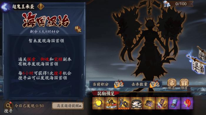 队伍人数上限为50人。人满后将获得御行达摩碎片*金币50000、现世符咒*游戏内神秘活动道具*30的奖励。若累计邀请人数为队伍中前5名,还能获取额外奖励。活动剧情与背景:涉及鬼王酒吞童子、铃鹿御前、黑晴明等角色的剧情对话。
