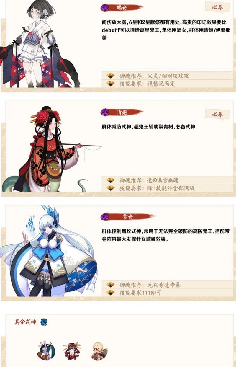 〖贰〗、阴阳师前十最强SR式神排名及推荐如下:茨木童子 特点:高伤害,单点及群攻能力强,适用于所有PVE活动,斗技中可打造一波流阵容。推荐御魂:4破势+2攻击/暴击,后期可选2套散件堆暴击和爆伤。镰鼬/山兔 特点:拉条式神,提升行动条速度,对斗技和副本效率提升极大。镰鼬还有控制及加攻能力。